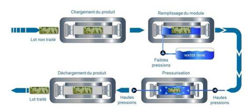 Concrètement, la pression est appliqué à l’aide d’une pompe à haute pression permettant d’acheminer l’eau et la compresser afin de la faire monter à la pression voulu. La pressions s’exerce le plus souvent avec de l’eau, ce qui donne le nom « hautes pressions hydrostatiques ». La pression appliqué étant en tout point de même force de toute direction, elle est dit isostatique.